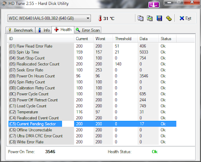 disk, the Current Pending Sector count is non-zero. The number 17 there,