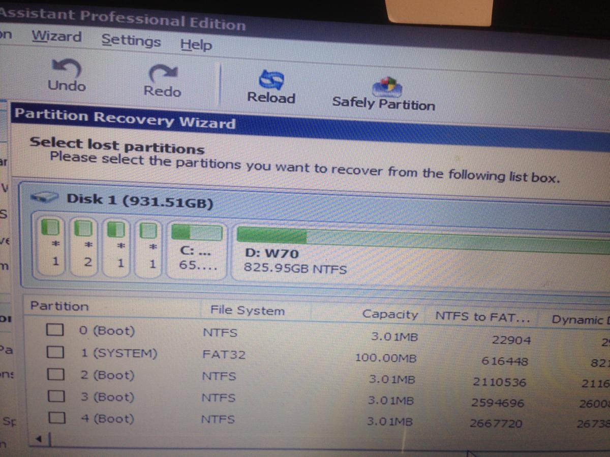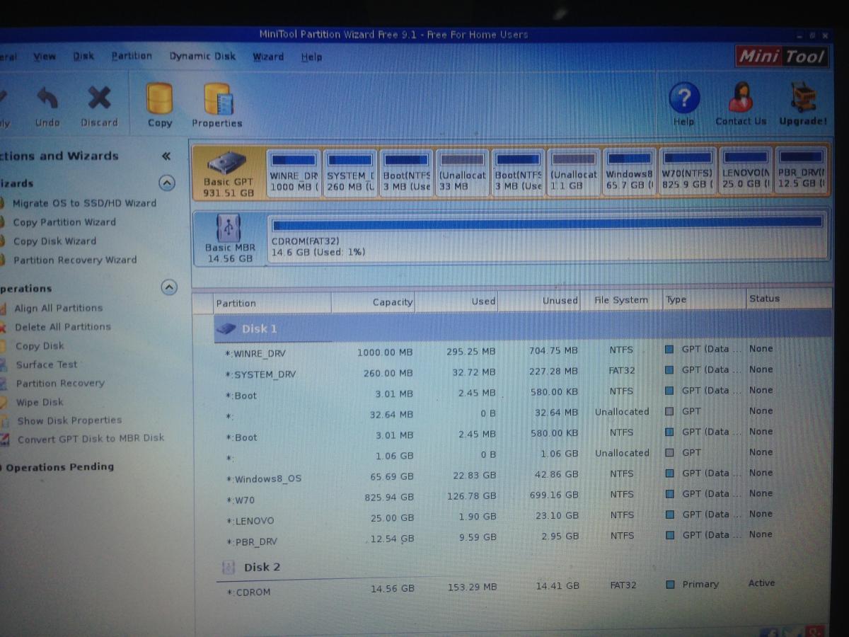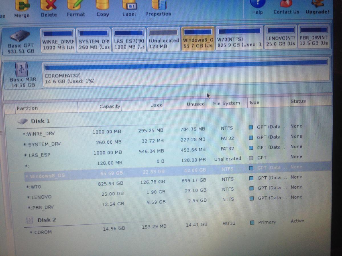 , Then I was playing around with the "Partition Recovery Wizard" on MiniTool USB boot menu and I selected multiple partitions to recover after it searched for an hour. IT recovered the partitions I selected but my hard drive looks weird now (attached pic). Now, Windows 8 and Windows 7 won't work. It just keeps boot looping off the Lenovo boot menu splash screen.